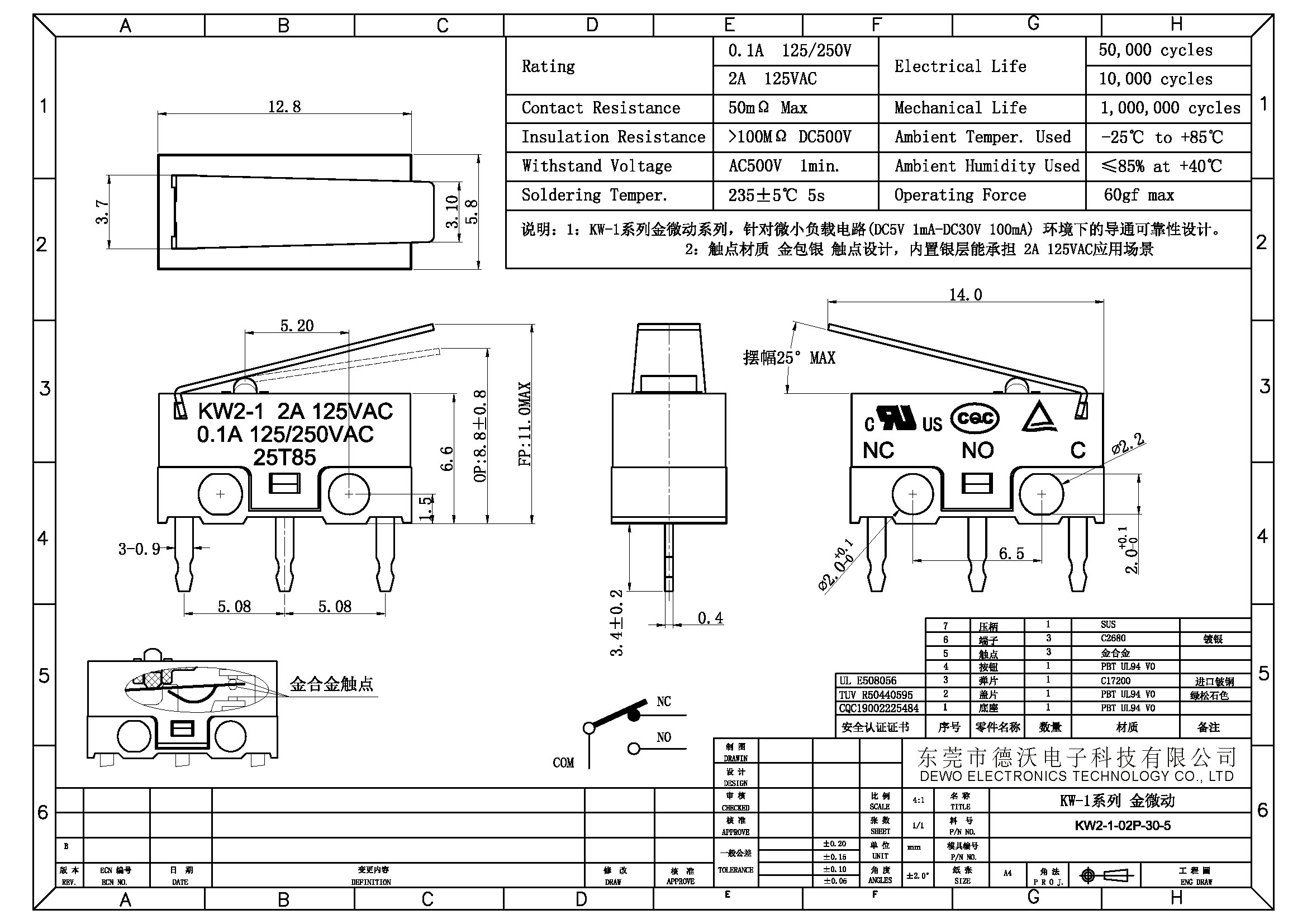 2.觸點材質(zhì):金包銀,內(nèi)置銀層能承擔(dān) 2A 125VAC應(yīng)用場景.